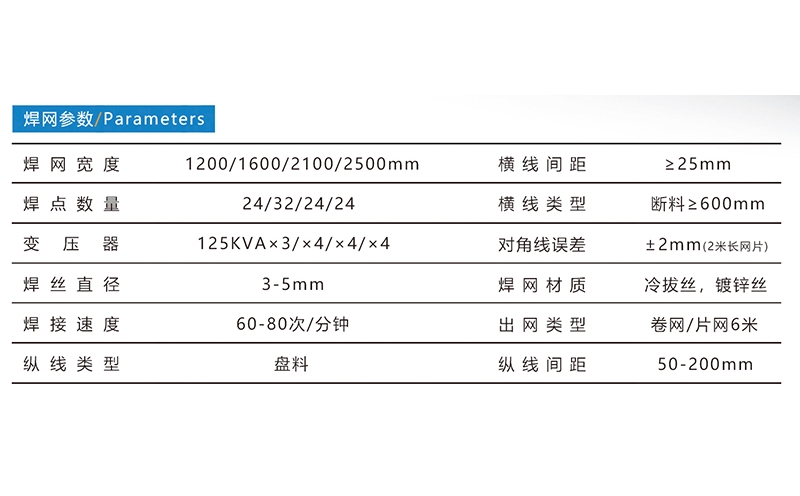 鋼絲網(wǎng)焊接生產(chǎn)線,焊接網(wǎng)寬度1200mm/1600mm/2100mm/2500mm,焊接絲徑3-5mm,焊接速度為60-80次/分鐘,縱線為盤料,橫線為斷料。標(biāo)準(zhǔn)配置:放線盤、經(jīng)絲壓輥、焊接主機(jī)、料斗、拉網(wǎng)。可選配置:校直輪裝配、剪網(wǎng)機(jī)、自動卸網(wǎng)卷網(wǎng)機(jī)、方管卷網(wǎng)機(jī)、落網(wǎng)裝置+落料小車、料斗平臺帶梯子、簡易循環(huán)冷卻器、出網(wǎng)平臺。河北驕陽焊工有限公司,0318-7063097