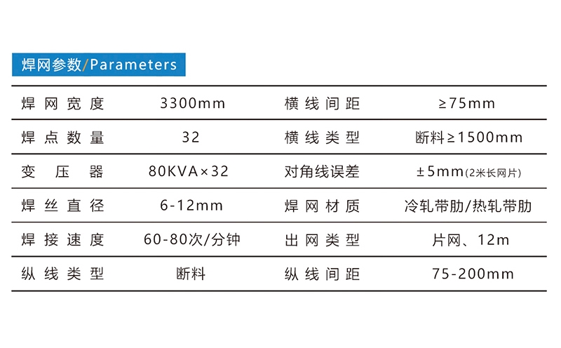 鋼筋網(wǎng)焊接生產(chǎn)線,焊接網(wǎng)寬度3300mm,焊接絲徑6-12mm,焊接速度為60-80次/分鐘,縱橫線均為斷料。標(biāo)準(zhǔn)配置:簸箕式輸網(wǎng)與落網(wǎng)、縱線不停機(jī)上料平臺、送徑小車、焊接主機(jī)、鏈?zhǔn)搅隙?、伺服拉網(wǎng)、工業(yè)冷水機(jī)。可選配置:快速拉網(wǎng)、升降式落網(wǎng)與輸網(wǎng)12米、翻網(wǎng)6米、空壓機(jī)。河北驕陽焊工有限公司,0318-7063097