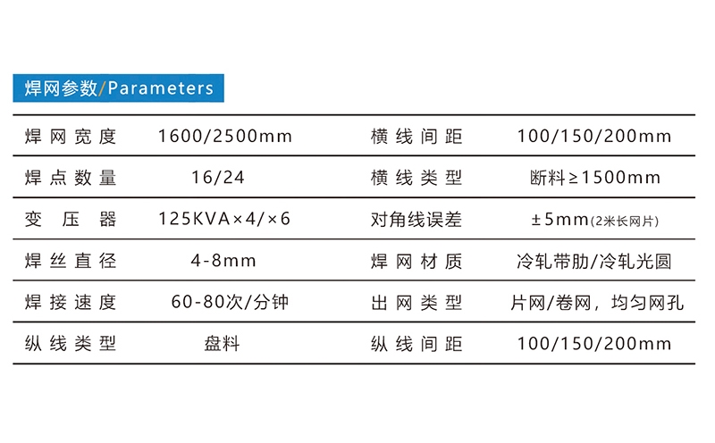 鋼筋網(wǎng)焊接生產(chǎn)線,焊接網(wǎng)寬度1600mm/2500mm,焊接絲徑4-8mm,焊接速度為60-80次/分鐘,縱線為盤料,橫線為斷料。標準配置:放線盤、縱線緩料、校直、叼絲、儲料、伺服送網(wǎng)、增料料斗、剪網(wǎng)、出網(wǎng)托架??蛇x配置:簸箕式輸網(wǎng)與落網(wǎng)、快速拉網(wǎng)+升降式輸網(wǎng)與落網(wǎng)、自動翻網(wǎng)、空壓機、自動卸網(wǎng)卷網(wǎng)機、冷水機。河北驕陽焊工有限公司,0318-7063097