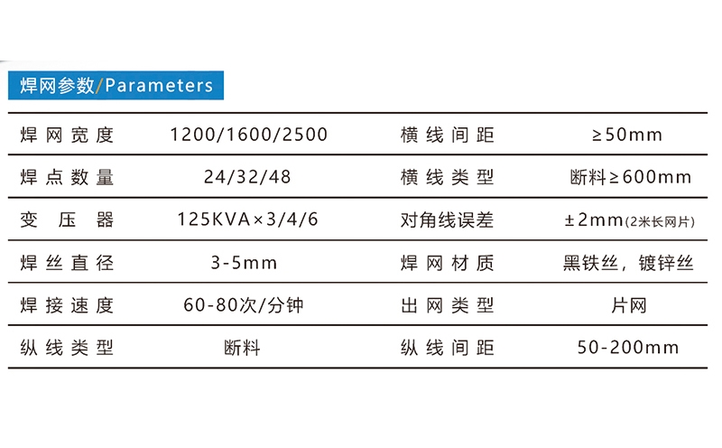 護(hù)欄網(wǎng)焊接生產(chǎn)線,焊接網(wǎng)寬度1200mm/1600mm/2500mm,焊接絲徑3-5mm,焊接速度為60-80次/分鐘,縱線橫線均為斷料。標(biāo)準(zhǔn)配置:托絲平臺、料斗、拉網(wǎng)平臺、小梯子。可選配置:縱線送料小車、簡易循環(huán)冷卻器、料斗平臺梯子。河北驕陽焊工有限公司,0318-7063097