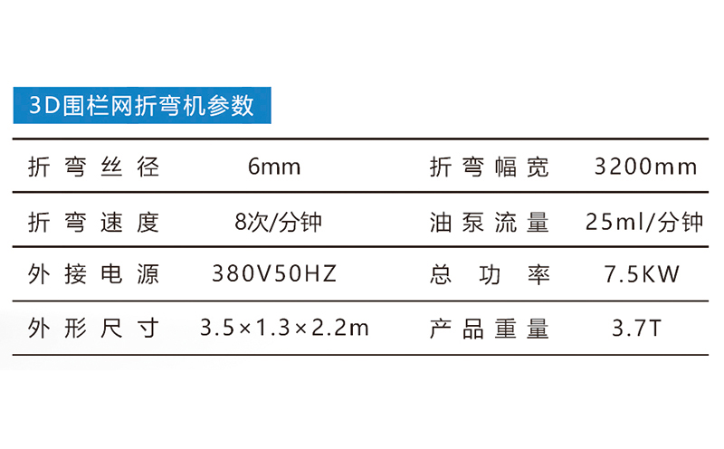 3D圍欄網(wǎng)折彎機,折彎絲徑6mm,折彎幅寬3.2米,折彎速度8次/分鐘。