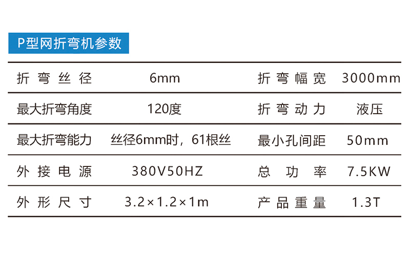 P型網(wǎng)折彎機,折彎絲徑6mm,折彎幅寬3米,最大折彎角度120度,最大折彎能力61根絲(絲徑6mm時)。